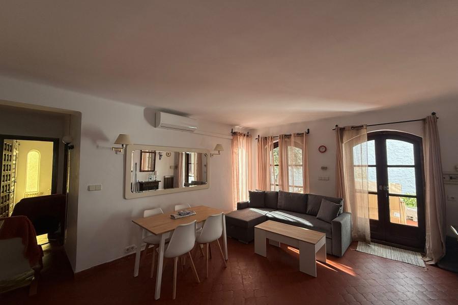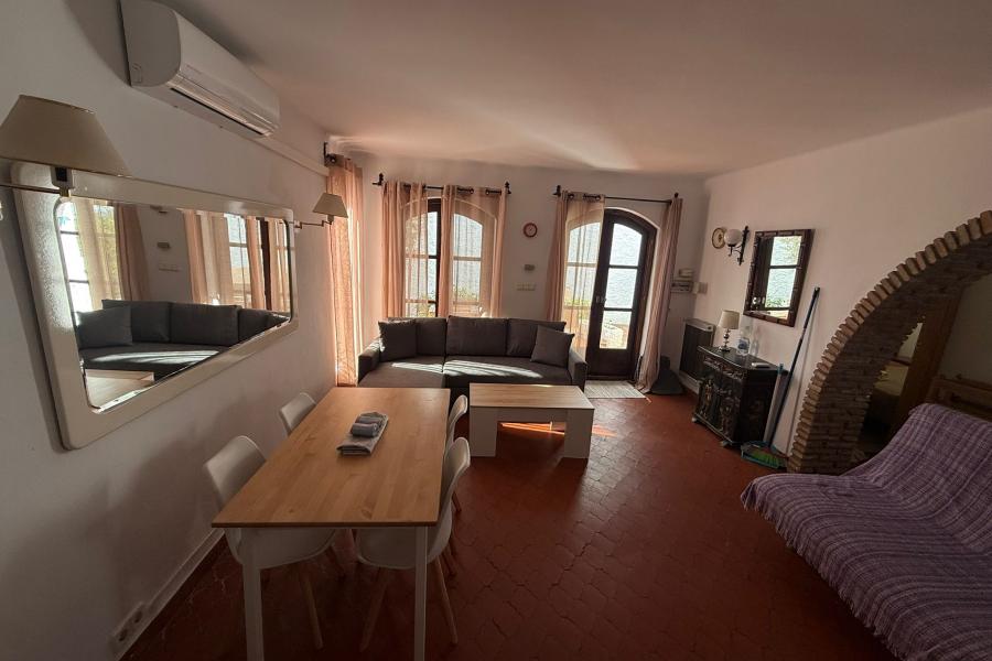 Villa en planta baja, compuesta de solarium con vista parcial del mar y de las piscinas, patio, jardín privado,salón-comedor con sofá cama y TV, dormitorio de 2 camas, dormitorio con cama de matrimonio, cuarto de baño.
